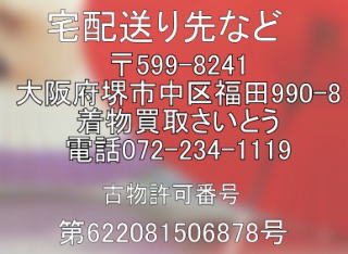 @ページにある電話番号から電話又は、メール、よりご依頼ください。 Aお電話、メールにて、商品のご依頼確認いたします。 B確認が済みましたら、宅配便で、当店まで商品を発送していただければ、 到着しだい査定いたします (送料着払いにて発送いただければ結構です。) 査定が終了いたしましたら、すぐに査定金額をお電話、 又はメールにてお知らせいたします。 C査定金額にご納得いただけましたら、そのまま買取。 D買い取り金額をすぐにご送金させていただきます。 E買取金額をご確認いただければ終了でございます。 査定金額にご納得いただけなければ直ちに商品は返品いたします。 ただし返品送料はお客様のご負担になります。 ご注意!!発送時は、商品が雨などに濡れないようにビニール袋に入れていただき、 何かのダンボール箱か、しっかりした紙袋に入れて発送いただければOKです。 商品と一緒に、ご本人様の確認書類「免許書のコピーか保険証のコピー」と 買取成立時の代金振込先口座番号の書いたメモを同封ください 。 (本人確認書類は古物営業法規定されております) プラスチックの衣装ケースやブリキの長持ちなどの箱はご遠慮ください。 |